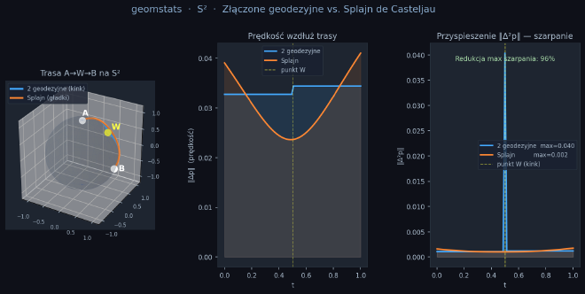 W poprzednim artykule wyjaśniliśmy geometryczną przyczynę szarpania na rozmaitości — nieciągłość wektora prędkości w punkcie złączenia dwóch geodezyjnych (kink). Teraz pokażemy jak skonstruować gładką alternatywę używając biblioteki geomstats i algorytmu de Casteljau na sferze.